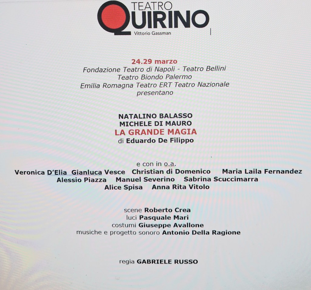 “Fra tutti i testi di Eduardo che posso dire di conoscere a fondo – sottolinea il regista Gabriele Russo – ritengo e sento che La Grande Magia sia quello più necessario oggi per i temi che affronta, per le relazioni che propone, perché è una commedia squilibrata, meno lineare e matematica delle altre, sospesa e caotica come il tempo in cui viviamo. … Ne consegue un continuo cortocircuito che confonde il piano dell’illusione con quello della realtà, destabilizzando i personaggi stessi e gli spettatori. Smarriti i personaggi, smarriti gli spettatori, smarriti gli uomini e le donne di oggi, smarriti nelle relazioni, smarriti nel continuo fondersi del vero e del falso. Cosa è vero? Cosa è falso?”.