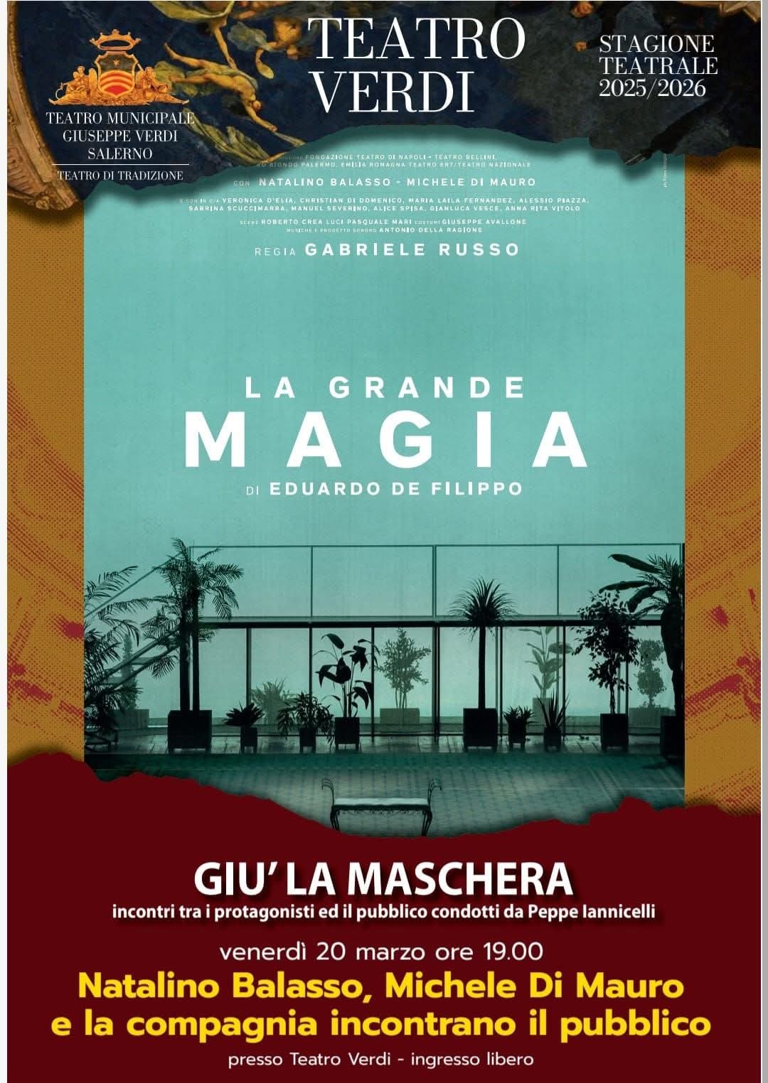 Si è svolto oggi, 20/3/26, “Giù la Maschera”, l’incontro tra il pubblico e gli attori Natalino Balasso, Michele di Mauro, e tutta la Compagnia che ha portato a Salerno lo spettacolo “La grande magia” di Eduardo De Filippo, con regia di Gabriele Russo.